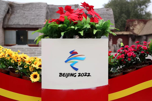 冰墩墩和雪容融站在花丛中,奥运五环模型中还设计了冰壶、速度滑冰等冰雪运动造型。